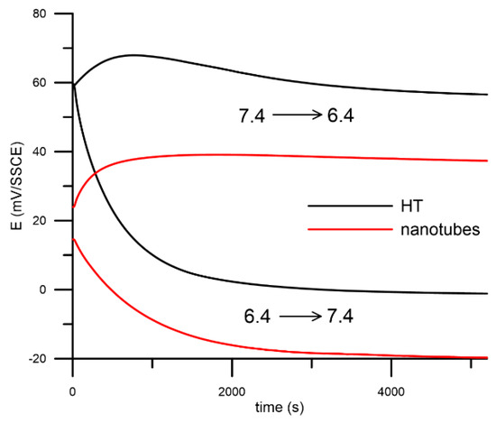 Another essential parameter for pH sensors in the medical field is the rate of response to changing conditions. The rate was tested by exposing the sample to one pH electrolyte and then transferring it to a second pH electrolyte without rinsing the original medium. The results are summarized in Figure 6. In the case of a pH drop, both samples show a faster response; however, for the nanostructured sample, potential stabilization was achieved within ten minutes, while for the hydrothermal treatment, stability was reached after one hour. When the pH increased, both surfaces showed comparable behaviour, but also in this case, stabilization occurred within an hour. In comparison with different systems, the reaction rate is slower [34,35]. However, given the intended application, the reaction rate is not critical and is compensated by long-term stability and ease of surface preparation.