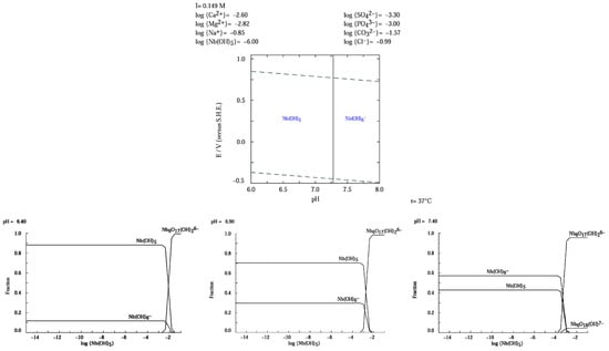 E–pH plot of niobium and fraction of its stable forms at different concentrations and pH in an inorganic blood plasma model, modelled in Hydra/Medusa [37]. The lines represent the equilibrium conditions for the compounds. The dashed lines represent the boundaries of the water stability region.