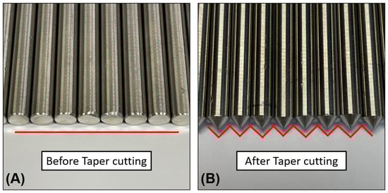 Inconel alloys are a unique product of the Special Metals Corporation (New Hartford, NY, USA), manufactured as a combination of carbon, iron, chromium, and nickel. They are widely used in a variety of advanced industries due to their superior mechanical and physical properties such as high heat resistance, corrosion resistance, and oxidation resistance and can maintain high strength at high-temperature environments [25]. Based on nickel, Inconel is divided into 600, 625, 718, and X750 depending on the content of elements such as iron, chromium, niobium, and molybdenum [26]. In this study, non-magnetic Inconel 625 bars were used as the workpiece, which was produced by GPLEX Corporation Co., Ltd., Uiwang-si, Gyeonggi-do, Republic of Korea, and they had a diameter of ∅6 mm with the original surface roughness Ra values of 0.31 μm. To fabricate the needle valve (solenoid valve stem), the Inconel 625 bars were initially cut into 100 mm long round bars by the lathe machine (model: Hwacheon (HL-380–750)) (Gwangsan-gu, Gwangju, Republic of Korea) ith a rotational speed of 335 RPM. Also, their single-sided edge was machined into a 45° cone shape at one end to match the stem of the needle opening and closing valve. A detailed dimensional view and a photograph of non-magnetic Inconel 625 bars are shown in Figure 1 and Figure 2, respectively. The chemical composition and mechanical properties of the workpiece used in the experiment are listed in Table 1 and Table 2, respectively.