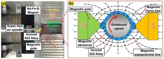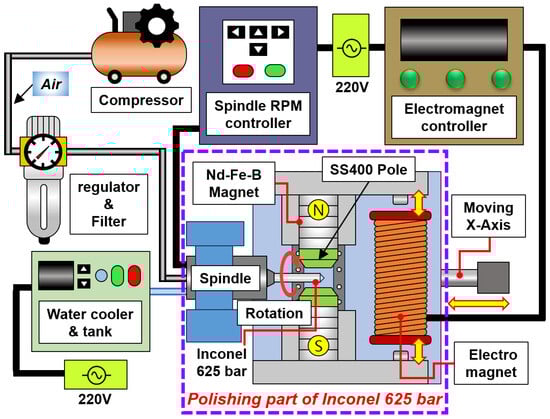 However, the MAF process has a major limitation—the difficulty of polishing the surface of materials such as Inconel 625 or ceramics [27,28]. Unlike the current MAF process that uses a permanent magnet [29] or electromagnet [30] as the magnetic field generator, the super-fast MAF process used in this study is a novel hybrid magnetic polishing technique. This technique combines a neodymium permanent magnet (Nd-Fe-B) and electromagnets for more efficient polishing of a hard material such as Inconel 625. Figure 3 shows a schematic diagram of the super-fast MAF system of a super-fast air spindle with hybrid magnets for polishing an Inconel 625 bar. As shown in Figure 3, the polishing system can be divided into a super-fast rotational workpiece, which can rotate up to 125,000 rpm, and a hybrid magnet of permanent and electromagnetic parts. To rotate the Inconel 625 workpiece, a super-fast air spindle uses a compressed air system with a rotational speed controller that can adjust the speed in the range of 1000–125,000 RPM. This spindle is fixed with bolts to an aluminum support so that it is not affected by fine vibrations generated during processing, and four pneumatic tube fittings are installed at the bottom, for compressed air injection and exhaust and for cooling water injection and discharge. The workpiece stimulation part concentrates the magnetic field generated by the neodymium (Nd-Fe-B) permanent magnet to ensure that the magnetic tool remains attached to the workpiece that rotates at high speed during processing. In addition, the stimulation part generates a stronger physical force through magnetic concentration to increase the compressive force of the magnetic tool and the workpiece. A hybrid of permanent and electromagnets was used to generate the strong magnetic field. Typical characteristics of an electromagnet are the adjustable strength of the magnetic field and its generation only when desired. However, electromagnets have a complex, bulky structure involving a control system and a power supply. While a permanent magnet does not require an external energy supply and has a simple structure, the strength of its field decreases over time, and it is difficult to change the amplitude and direction of the magnetic field. Therefore, these two types of magnets are combined to allow adjustment of the flux density of the magnetic field to 550 mT. A 550 mT magnetic field is strong enough to control the magnetic abrasive tools used to polish the surface of Inconel 625.