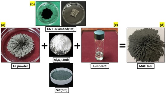 Images of a mixture of magnetic abrasive tools: (a) Fe power; (b) CNT + diamond paste (1st), Al2O3 (2nd), and SiC (3rd); (c) lubricant, and (d) their mixture to produce an MAF tool.