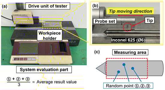 The surface roughness measurement equipment (model: SJ-400 Mitutoyo) (Mitutoyo, Sakado, Japan) was a contact type that detects changes as if drawing along the surface using a tentacle among contact and contactless measuring instruments and calculates measurement results based on roughness curves. Figure 6 shows the images of the surface roughness measurement equipment and the method for measuring the surface of Inconel 625 bars. Figure 6a shows a full image of the surface roughness measuring process by SJ-400 Mitutoyo equipment for the Inconel 625 bar workpiece. Figure 6b shows an enlarged view of the measuring process on the surface of the workpiece. Figure 6c shows the measuring method at three different points on the surface of the workpiece. In this study, the total processing time of the super-fast MAF process was 16 min and a total of five surface roughness measurements were performed in 4 min increments to measure and compare the surface condition before and after processing.