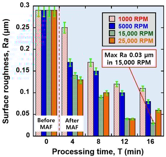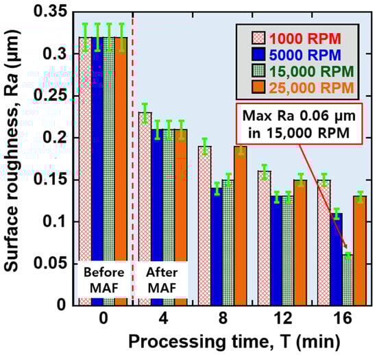 Figure 9 shows the change in surface roughness Ra when using alumina (Al2O3) as the abrasive. The surface roughness decreased at all rotational speeds by the super-fast magnetic abrasive finishing (MAF) process using alumina abrasive. The results showed that the Ra value of the Inconel 625 bar decreased from 0.31 μm to 0.11 μm, 0.08 μm, 0.03 μm, and 0.06 μm at rotational speeds of 1000 rpm, 5000 rpm, 15,000 rpm, and 25,000 rpm, respectively, after 16 min of the processing time. At 15,000 rpm, the best Ra value of the Inconel 625 bar was achieved at 0.03 μm. Figure 10 shows the change in the Ra value of Inconel 625 bars when using SiC abrasive particles. The Ra value of Inconel 625 bars was reduced at all speeds by super-fast MAF using SiC abrasive. The Ra of 0.31 μm was reduced to 0.15 μm, 0.11 μm, 0.06 μm, and 0.13 μm after polishing for 16 min at rotational speeds of 1000 rpm, 5000 rpm, 15,000 rpm, and 25,000 rpm, respectively. However, the surface roughness Ra values of Inconel 625 bars were difficult to reduce to 0.06 μm when the SiC abrasive was used.