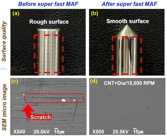 Figure 11 shows photographs and 500× SEM micro images comparing the surface of the Inconel 625 bar before and after the super-fast MAF process. Figure 11a is an image of the original workpiece before treatment, with an Ra value of 0.31 μm and a very rough surface with poor qualities such as blurriness and low reflection. Figure 11b is an image after polishing for 16 min at 15,000 rpm using a CNT + diamond abrasive. The best surface roughness reduction was obtained at these conditions, producing an Ra value of 0.02 μm. Figure 11b shows the high surface quality with a mirror-like surface producing high reflection). Figure 11c,d shows a 500× SEM micro image of the surface before and after processing. The initial surface was rough, with multiple grooves of different depths (see Figure 11c). Figure 11d shows the surface after processing, with the removal of all rough structures. The results confirm that the super-fast MAF process can reduce material surface roughness to produce a super-smooth surface on materials.