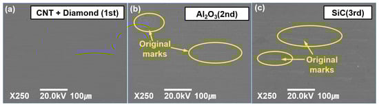 SEM micro images comparing the surface of the Inconel 625 bars after polishing by different types of abrasive particles: (a) CNT + diamond (1st), (b) Al2O3 (2nd), and (c) SiC (3rd) abrasives.