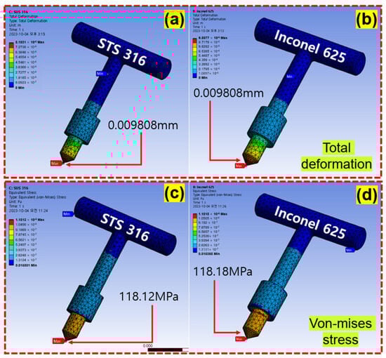 Maximum total deformation and von Mises stress results for two materials: (a) total deformation of STS 316, (b) total deformation of Inconel 625, (c) von Mises stress of STS 316, and (d) von Mises stress of Inconel 625.