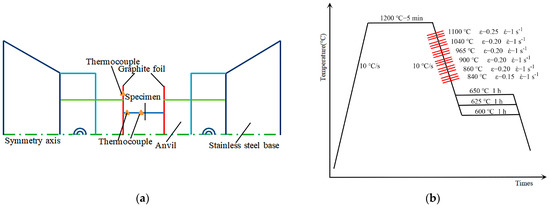 (a) Schematic diagram of hot compression in Gleeble 3500; (b) schematic diagram of the thermos-mechanical processing schedule involving 6-pass reduction. Abbreviations: —strain rate; ε—strain.