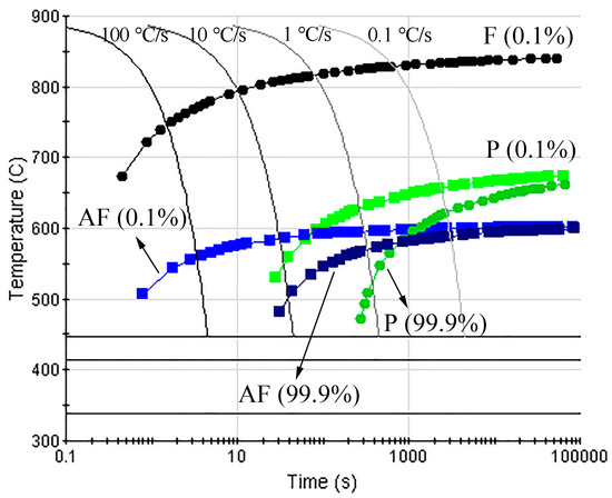 Continuous cooling transformation diagram of the experimental HSLA steel calculated using JMatPro (F for ferrite; AF for acicular ferrite; and P for pearlite; Black for F (0.1%); light green for P (0.1%); dark green for P (99.9%); light blue for AF (0.1%); dark blue for AF (99.9%)).
