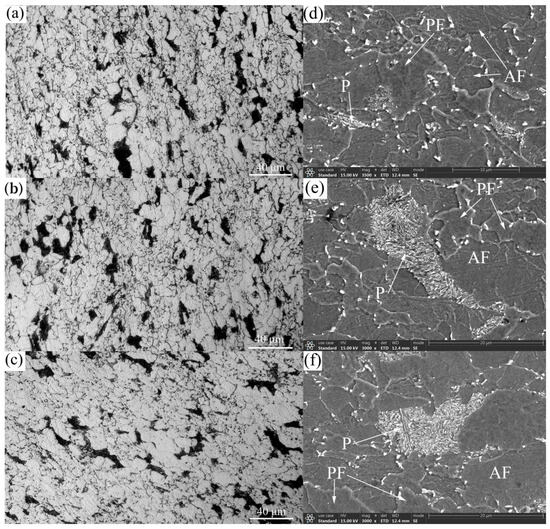 (a–c) Optical micrographs and (d–f) SEM micrographs of TMCP Nb-Ti HSLA pipeline steel at different coiling temperatures: (a,d) 600 °C; (b,e) 625 °C; and (c,f) 650 °C.