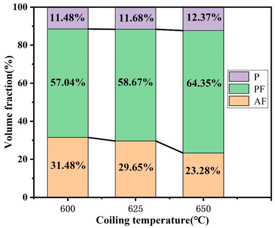 Figure 3 shows the microstructure of the steel at different CTs of 600, 625, and 650 °C, respectively. Figure 3a–c show that the microstructure was mainly composed of acicular ferrite (AF), polygonal ferrite (PF), and pearlite (P) as labeled. After being etched by 2% nital solution, P could be seen as a dark area under OM. The volume fraction of the P was calculated by its area percentage of the OM micrographs. As can be seen in Figure 4, the volume fractions of P were found to be 11.48, 11.68, and 12.37% at CTs of 600, 625, and 650 °C, respectively.