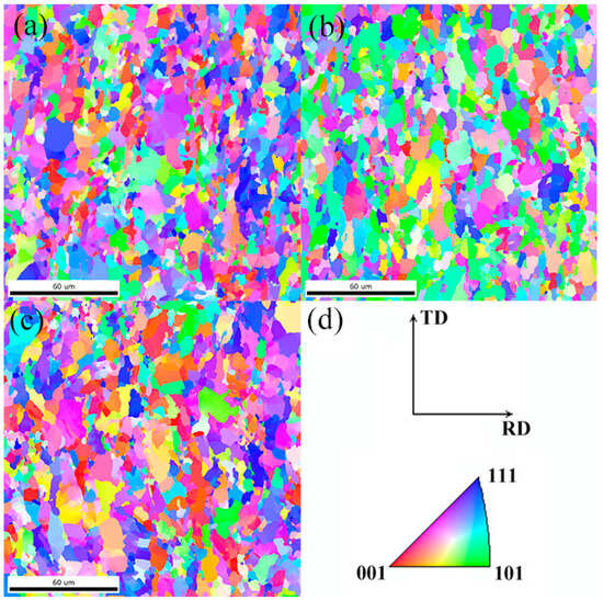IPF maps taken from the longitudinal section at CTs of (a) 600 °C, (b) 625 °C, and (c) 650 °C. (d) Inverse pole figure color key.