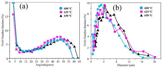 (a) Grain boundary angle distribution and (b) grain size distribution at CTs of 600, 625, and 650 °C.