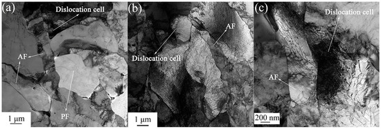 Figure 7 shows the detailed morphology of AF observed under TEM. The AF grain size was found to be between 0.31 μm to 1.48 μm with high-density dislocations and dislocation cells. The PF showed almost less dislocation due to its diffusional phase transformation. It can be deduced that the size of PF grains was small and the microstructure was uniform at lower CTs. On the contrary, the AF exhibited a complex dislocation structure. Both the high density and a large number of dislocation cells were generated by the mutual entanglement of dislocations. This dislocation structure can substantially increase the stress required for the dislocation slip and increase the strength of the steel [33]. In general, there was higher dislocation density at lower CTs. These dislocations also served as effective nucleation sites for precipitates. In other words, the CT of 600 °C was optimal for a good combination of strength and toughness.