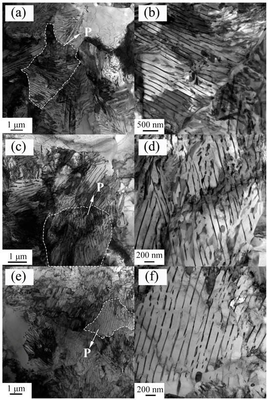 Figure 8 illustrates the P microstructures observed under TEM. The interlamellar spacing was found to be 129.5, 148.5, and 150.4 nm at CTs of 600, 625, and 650 °C, respectively, i.e., the lamellar spacing increased with the CT. The carbonitrides that were induced by the reduction formed near the austenite grain boundaries. The reduction of carbon content in austenite is conducive to P transformation [34].