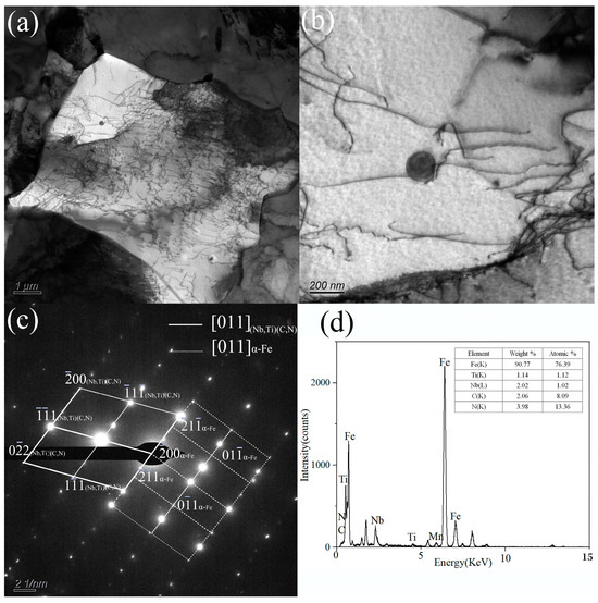 Figure 9 shows a thin foil TEM micrograph at a CT of 600 °C. As can be seen, a large number of nano-sized precipitates were distributed in the matrix and displayed different morphologies according to Figure 9a. In Figure 9b, one of the particles was selected to further analyze the composition and structure. The selected area electron diffraction (SAED) used in conjunction with the EDS showed that the precipitates were rich in Fe with small amounts of Nb, Ti, C, and N in Figure 9c,d. As most of the Fe content came from the matrix, the precipitates were identified as (Nb, Ti) (C, N) and had an orientation relationship in ferrite of [011](Nb, Ti)(C, N)/[011]α-Fe.