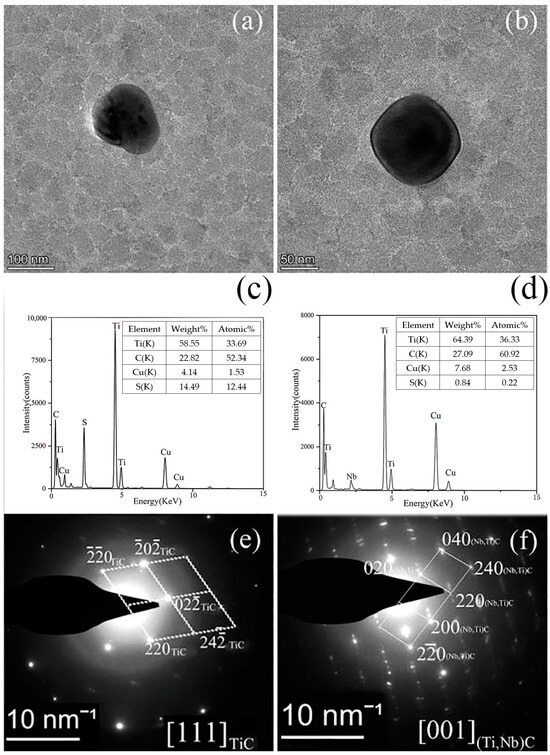 Figure 10a shows the elliptical morphology of the precipitates with a diameter of approximately 113.4 nm. The SAED and EDS analyses in Figure 10c,d show that the precipitates mainly contained Ti, C, and a small amount of sulfur. Part of the C and all the Cu were from the carbon film and the copper mesh, respectively. Therefore, the content of C in the precipitates could not be accurately measured. The precipitate had a face-centered cubic structure with a lattice constant of 0.4317 nm. Therefore, it was deduced that the precipitate was TiC. The morphology of another precipitated phase in Figure 10d was round with a diameter of 132.2 nm. The EDS analysis showed that this precipitate comprised Ti, Nb, and C, as shown in Figure 10e. Combined with SAED analysis (Figure 10f), it was deduced that this was (Nb, Ti)C with a face-centered cubic structure and a lattice constant of 0.4427 nm.