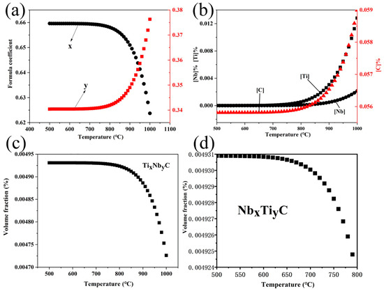 Figure 12a shows the effect of temperature on the chemical formula coefficient of the TixNbyC in micro-alloyed steel. It can be seen that the TixNbyC is rich in a higher proportion of Ti atoms from 500 to 800 °C. As the temperature decreases, the proportion of Ti atoms decreases slightly. Figure 12b shows the effect of temperature on the equilibrium solid solution content of Ti, Nb, and C elements. The equilibrium solid solution amounts of Ti, Nb, and C elements gradually decrease with temperature and the downward trend gradually becomes slower. This shows that the TixNbyC is more prevalent at high temperatures. Figure 12c,d show the temperature dependence of the TixNbyC in ferrite. The volume fraction of the TixNbyC increases with a decrease in temperature, and when the temperature drops down to 950 °C, the increase in the volume fraction of the precipitates gradually becomes slower.