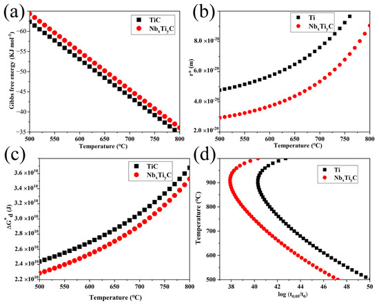 The calculated Gibbs free energy, critical nucleation size, activation energy, and PTT curves are shown in Figure 13 for TixNbyC and TiC precipitates. It can be seen from Figure 13a that the Gibbs free energy of TixNbyC is larger than that of TiC for the same temperature because TixNbyC has higher supersaturation. As a result, the calculated TixNbyC critical embryos are finer than those of the TiC, as shown in Figure 13b,c.