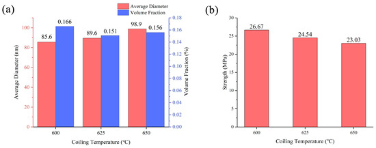 where σp is the incremental strength, MPa; G is the shear modulus, 81,600 MPa for Fe matrix; b is the burgers vector, 0.248 nm for body-centered cubic (BCC); X is the average diameter of the particles, nm; and f is the volume fraction of the precipitates. Based on the statistical analysis of precipitates in Figure 11, σp can be calculated as 26.67, 24.54, and 23.03 MPa at the CTs of 600, 625, and 650 °C, respectively. The average diameter and volume fraction of the precipitates and σp at different CTs are shown in Figure 14. It can be concluded that the average diameter of the precipitates increased with the CT while the volume fraction showed no significant change. According to Formula (16), the small size and large volume fraction are beneficial for strength, so the σp value decreased with the CT.