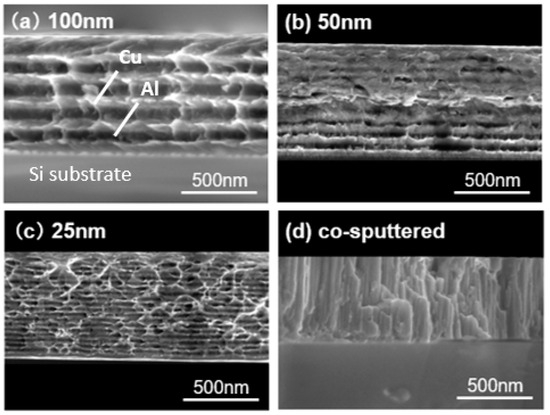 Cross-sectional SEM imaging showed well-defined layered structures in the as-deposited Cu/Ni and Cu/Al mutilayers, and columnar structures in their corresponding co-sputtered counterparts.