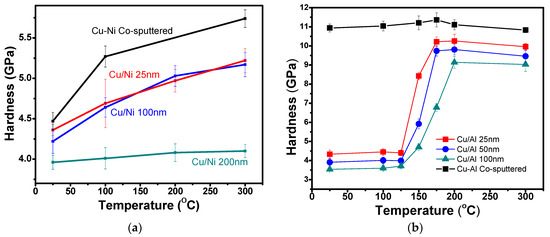 The hardness of (a) Cu/Ni multilayer and co-sputtered Cu-Ni, and (b) Cu/Al multilayer and co-sputtered Cu-Al thin films with different annealing temperatures and different layer thicknesses.