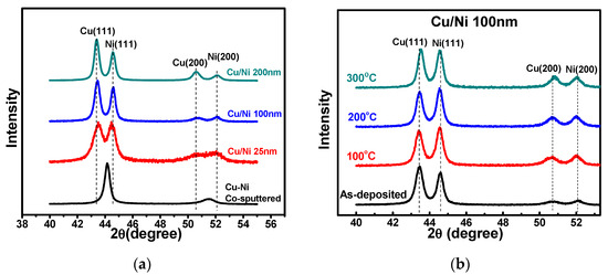 XRD was performed to characterize the microstructure and phase transformation of both systems upon annealing. Figure 4a presents the XRD spectra of the as-deposited Cu/Ni multilayers and co-sputtered Cu-Ni samples. Both Cu and Ni exhibit an FCC structure with prominent peaks for Cu (111), Ni (111), Cu (200), and Ni (200). Analysis of different layer thicknesses revealed a slightly reduced distance between Cu (111) and Ni (111) peaks in the 25 nm layer sample. The decreased peak distance is probably due to distortion of the lattice at each layer interface. The larger number of interfaces in the 25 nm layer thickness sample are expected to result in a higher amount of distortion and subsequent residual stress. Previous work showed that as the layer thickness reduced from 100 nm to 25 nm, the residual stress in the Ni layers increased from 0.88 GPa to 1.45 GPa [31]. For the Cu-Ni co-sputtered sample, the Cu and Ni peaks—Cu (111) and Ni (111), Cu (200) and Ni (200)—merge between their original positions in the thicker layers, indicating a new FCC structure with a lattice constant in between those of Cu and Ni.