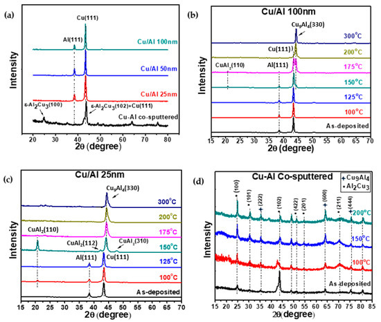 XRD spectra for Cu/Al thin films: as-deposited samples of different layer thickness (including the co-sputtered) (a); as-deposited and annealed samples: (b) individual layer thickness of 100 nm, (c) individual layer thickness of 25 nm, and (d) co-sputtered Cu-Al.