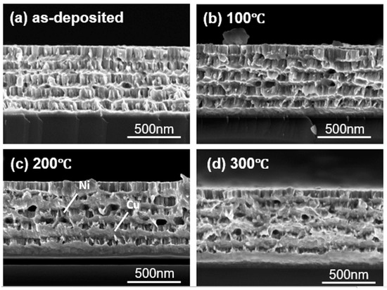 Annealed samples show distinct cross-sectional morphologies compared to their as-deposited counterparts. In Figure 6, cross-sectional SEM images of the 100 nm layer thickness Cu/Ni as-deposited sample and those annealed at 100 °C, 200 °C, and 300 °C reveal notable changes. The as-deposited sample displays a clear layer-by-layer structure. However, in samples annealed at higher temperatures, the Cu layer appears significantly thicker than in the as-deposited state. This effect is particularly pronounced in the 300 °C annealed sample, indicating increased diffusion between Cu and Ni layers with higher annealing temperatures.