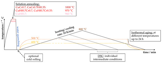 Identically processed alloys CuCr0.7, CuHf0.7, CuCr0.7Hf0.35, CuHf0.7Cr0.35, and CuHf0.7Cr0.7 were the basis of investigations. The 500 g weighing specimens were cast in a gravity die casting process with a VC400 casting machine (Indutherm Blue Power Casting Systems, Walzbachtal, Germany). Raw material Cu-OFE with the individual amount of master alloys (CuHf60 and CuCr10) was melted in a boron nitride-covered graphite crucible and was cast at 1300 °C in a graphite die (5 mm thick bar). Melting and casting were conducted under vacuum conditions. The alloy composition and maximum derivation of 0.05 wt.% from the target composition was proven with a calibrated optical emission spark spectrometer (Spectrotest, SPECTRO Analytical Instruments GmbH, Kleve, Germany). Then, a 120 min solution treatment in a preheated furnace (ME65/13, Helmut ROHDE GmbH, Prutting, Germany) followed by water quenching resulted in a supersaturated solid solution. All steps of heat treatments are visualized in Figure 1. With respect to maximum solubility in copper, CuCr0.7 was annealed at 1000 °C, CuHf0.7 at 960 °C, and ternary alloys at individual temperatures. Therefore, the first experiments analyzed the lowest electrical conductivity after annealing at different temperatures between 1000 °C and 960 °C, guided by metallographic investigations to evaluate the process for the maximum solution. Consequently, CuCr0.7Hf0.35 was heat-treated at 1000 °C, and CuHf0.7Cr0.7 and CuHf0.7Cr0.35 used 970 °C.