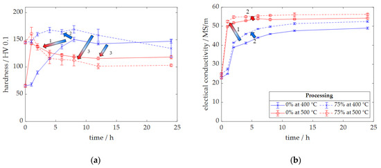 Regarding hardness, a similar picture can be drawn. Higher aging temperatures significantly accelerated precipitation reactions resulting in hardness increases (Figure 2a—Arrow 1), and pre-deformation shifted the peak hardness to appear earlier as well (Figure 2a—Arrow 2). Cold rolling before heat treatment increased peak hardness at both aging temperatures from 154 HV 0.1 to 169 HV 0.1 (400 °C aging temperature) and 143 HV 0.1 to 161 HV 0.1 (500 °C aging temperature). The maximum hardness showed the benefits of a lowered aging temperature as both specimens (with and without pre-deformation) reached higher values at a 400 °C aging temperature. Furthermore, the higher aging temperature resulted in faster and sharper overaging effects. Especially the cold worked specimen in Figure 2a showed overaging during heat treatment as hardness dropped by about 58 HV 0.1 (500 °C: from peak condition after 1 h to 24 h aging) and 35 HV 0.1 (400 °C: from peak condition after 8 h to 24 h aging) from its peak value.