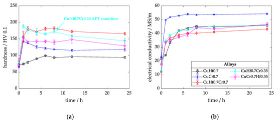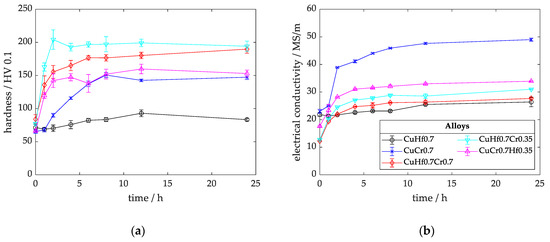 Whereas higher temperature was beneficial for the physical properties, hardness (Figure 5a) was significantly influenced by overaging effects. This drop of mechanical properties was a critical disadvantage for binary CuCr0.7, whereas CuHf0.7 did not reach the hardness level of its pre-deformed options. Alloying copper with hafnium and chromium shifted all of these effects in a favorable direction, as the ternary alloys reached high hardness values fast (at this temperature, after 2 h 183 HV 0.1 for CuHf0.7Cr0.7, after 1 h 189 HV 0.1 for CuHf0.7Cr0.35 and after 1 h 154 HV 0.1 for CuCr0.7Hf0.35) in combination with slower and less distinctive overaging (Figure 5a). Whereas hardness sharply dropped for CuCr0.7 after its peak aged condition, the ternary options mitigated this disadvantage at a higher absolute hardness level.
