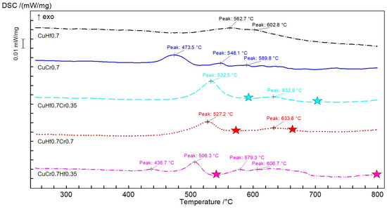 The highest wt.%-ratio of Hf/Cr was observed in CuHf0.7Cr0.35, which characterized the effect of alloying CuHf0.7 with small amounts of chromium. The first visible exothermic peak of the DSC curve shifted to 533 °C, whereas the first visible peak of the binary CuHf0.7 alloy was at 563 °C (Figure 6). With the information of correlating metallographic analysis in Figure 7, this first peak could be evaluated. The brightly contrasted enhanced hafnium concentrations could be referred to intermetallic CuHf phases in Appendix A, Figure A1 utilizing EDS. Furthermore, Figure 7 shows that hafnium atoms tend to migrate into the intergranular space (1) resulting in a precipitate-free zone (4) next to the grain boundary. Within the grains, homogenously distributed precipitates (3) were visible and arranged in some areas on preferred crystallographic planes (2). In conclusion, the first peak of the DSC curve could be related to precipitation reactions with intermetallic CuHf phases. The condition after the first peak showed fine and homogenously distributed precipitates (Figure 7a—Detail 3) within the grains and a slight tendency of these structures to nucleate and grow with preferred orientations (superordinate visible line structures in Figure 7a—Detail 2). Furthermore, a second peak appeared for the ternary alloy at 633 °C, which was after the exothermic effects of binary options (Figure 6). The corresponding metallographic analysis after heating up to 700 °C (Figure 7b) showed coarsening of the already known precipitates. With identical magnification, the visual impression fitted to the trend of growing and coarsening precipitates (Figure 7b—detail 5) as some of them were already in a rod-like shape (Figure 7b—detail 6) and seemed to disappear at the expense of fine earlier-stage precipitates (Figure 7a—Detail 3). Corresponding to the EDS analysis of Appendix A, Figure A1, no further statement about accumulations of chromium could be made at this point.