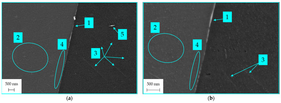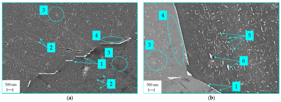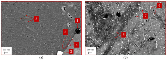 Further heating up to 800 °C exaggerated place-taking effects for metallographic investigations in Figure 9b, where some coarsened intermetallic CuHf precipitates (Figure 9b—Detail 2) and ripened rod-like Hf-containing needles (Figure 9b—Detail 3) were visible with bright contrast. Contextualizing the dark contrasted phases, known as Cr-containing particles, enabled investigating smaller dark elliptic structures (Figure 9b—Detail 4) and referring them to coarsened Cr-containing precipitates.