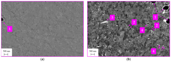 Figure 3a shows how sensitively the alloy reacted to cold rolling prior to an aging process, as the reachable hardness level was mainly affected by this processing. For specimens without pre-deformation, higher aging temperature helped to introduce precipitation reactions and increasing physical properties, characterized by electrical conductivity in Figure 3b. Overall, the cold rolled specimen reached significantly higher electrical conductivities (44.8 MS/m for aging at 400 °C, 51.8 MS/m for aging at 500 °C) compared to the specimen of the directly aged solid solution (32.9 MS/m for aging at 400 °C, 45.9 MS/m for aging at 500 °C); see Figure 3b. The development of electrical conductivity and hardness showed how precipitation processes were accelerated by an increased aging temperature (Figure 3—Arrow 1) and the introduction of pre-deformation (Figure 3—Arrow 2).