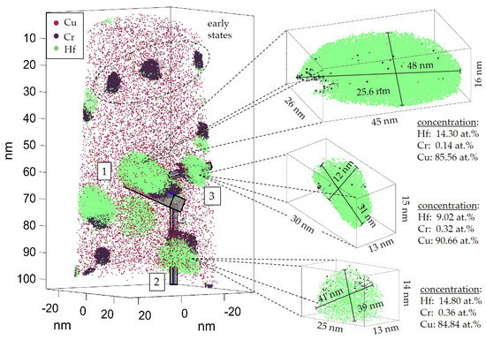 In Figure 11, it is directly visible that CuHf structures were persistently localized next to precipitates with high chromium content. Figure 12b illustrates the result of calculations on five chromium clusters with a slightly elliptic shape. The size of these structures was about 8 nm to 13 nm with an average volume of 290 nm3. These precipitates in the lower nanometer scale were finely and homogenously distributed in the material. Comparing different accumulation of precipitates offers the opportunity to follow the attachment of hafnium atoms to the interface between the Cr-containing precipitate and the copper matrix during the following aging treatment (Figure 12a). With further accumulation of hafnium atoms, independent Hf-containing precipitates nucleated and grew, and their morphology developed in an elongated shape (Figure 12a). For example, as shown in Figure 11, the upper and largest intermetallic CuHf precipitate had its origin of growth on the surface of the precipitate with high chromium concentration.