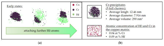 Details of results from APT measurement: Evolution of growing intermetallic CuHf next to Cr-containing precipitates with the continuous attachment of hafnium atoms (a). Analysis of atomic concentrations in clusters referred to Cr-containing phases and the copper matrix (b).