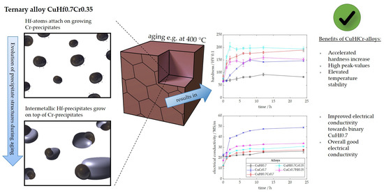 For an aging treatment at 400 °C, Figure 4 displays resulting properties and visualizes the differences of binary alloys in contrast to several ternary combinations: CuHf0.7Cr0.7, CuHf0.7Cr0.35, and CuCr0.7Hf0.35.