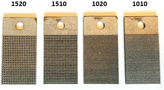 The metallic substrates are fabricated utilizing a LPBF Renishaw machine [29], employing a biomedical-grade Ti6Al4V alloy. The nominal power of the pulsed laser of the machine is 200 W with a layer thickness of 0.060 mm. The particle size of the material is in the range of 0.015 mm and 0.045 mm. Other specific details regarding printing parameters and powder specifications are withheld. As illustrated in Figure 3, the metal substrate comprises two distinct regions: a solid section featuring a hole intended for a potential bolted connection and a porous region designed for contact with the CFRP. The porous section incorporates a Simple Cubic cell lattice structure, with variations in unit cell dimensions, including height h, width w, and the diameter of the struts d. Each specimen is uniquely coded for post-lamination identification. The as-designed dimensions of the metal substrate are presented in Table 1. Table 2 provides comprehensive characteristics of the seven distinct configuration of Hybrid Junction specimens. To ensure the robustness of the data, two specimens have been tested for each of the seven unique configurations of the Hybrid Junctions. Accordingly, a total of 14 specimens have been produced. Notably, specimens 1020 and 1520 are configured with pins positioned atop the lattice, situated at the vertices of the cubic cell. The pins share the same diameter d as the struts, and their height is documented in Table 2. Notice that in Table 2, the specimen 1005 has two different designations, named and . This is due to the fact that this kind of specimen has two different dimensions of the SC cell on the lattice substrate.