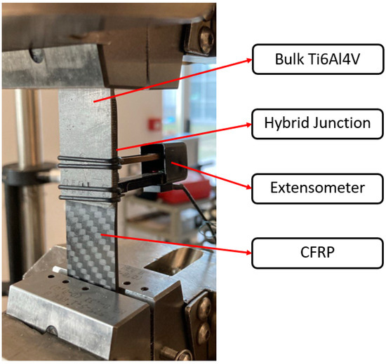 The specimens are subjected to single shear lap configuration testing following the guidelines outlined in ASTM D5868 [28]. A hydraulic machine, specifically the Instron 8516, equipped with a 100 kN load cell, is employed for this purpose. Hydraulic grips are utilized to clamp the specimens securely, mitigating the risk of potential slippage. The clamping pressure is set at 80 bar, a parameter tailored for aluminum materials. The testing velocity is fixed at 1 mm/min, and an extensometer is deployed to measure the elongation of the junction. Positioned on the CFRP side, the extensometer is situated 5 mm from the bottom edge of the metal part, as shown in Figure 6. Notably, the extensometer is removed after an observed elongation of 2 mm and prior to specimen failure.
