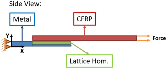 To replicate testing conditions, the metal substrate is anchored at one extremity, while the CFRP at the other extremity is subjected to a force consistent with experimental loads. To enhance the computational efficiency of the Finite Element Method (FEM), the intricate interaction among the lattice structure, resin, and CFRP is simulated using a simplified approach. Assuming a uniformly distributed resin in the lattice substrate as a reasonable hypothesis, the overall behavior is modeled by postulating the existence of a fictitious material amalgamating the properties of the two elements. These properties are computed using the Homogenization technique. Conversely, the CFRP component undergoes testing to derive its elastic properties. Given the straightforward geometry of the single lap specimen, the model is developed using 2D elements, further diminishing the computational cost of the simulation. This strategic modeling approach facilitates an efficient representation of the complex interplay within the Hybrid Junction while maintaining computational feasibility.