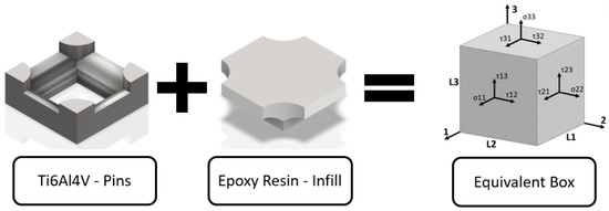 To simulate the interaction between the resin and the lattice structure, a homogenized model has been developed [30,31]. The repetitive unit cell is substituted with an equivalent box possessing the corresponding material properties. A Representative Volume Element (RVE), comprising the Simple Cubic (SC) cell and its infilled volume with resin, has been formulated. Both sub-volumes are discretized using a solid quadratic mesh of Solid 186 elements. Special attention has been paid to mesh generation to attain symmetry and ensure the presence of symmetric nodes on opposite faces. This has enabled the implementation of periodic boundary conditions on the RVE. Nodes situated at the contact interface between the lattice structure and the epoxy resin infill are deliberately generated at coincident locations. By utilizing the merge command, a seamless simulation of perfect bonding between the two elements is achieved. This meticulous modeling approach aims to accurately capture the behavior of the Hybrid Junction, considering the complex interplay between the lattice structure and the resin during simulation. In Figure 8, are depicted the volumes for SC cell, epoxy resin, and the resulting RVE with the equivalent material properties.