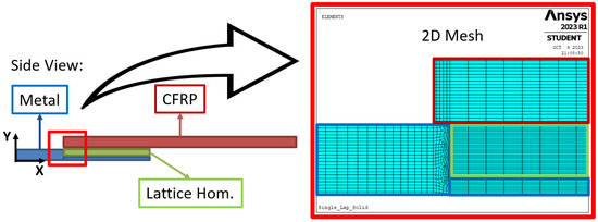 After completing the homogenization calculations for various structures and having established the CFRP properties through testing, the comprehensive simulation of the entire single lap specimen can be conducted. The model, depicted in Figure 7, has been discretized using a mapped mesh featuring quadratic Plane 183 2D elements, with the option of Plane Strain. This hypothesis is justified by the predominant width of the specimen in comparison to its thickness. To simulate a bonded contact between different materials, nodes have been merged. Figure 10 provides a detailed view of the mapped mesh utilized in the model. This modeling approach ensures a precise representation of the Hybrid Junction, allowing for a thorough examination of its mechanical behavior under specified loading conditions.