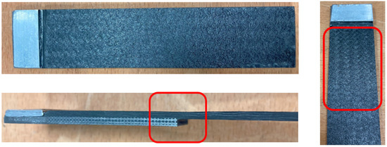 Novel Hybrid Junctions have been fabricated following the procedure outlined in Section 2.1. The resulting specimens are illustrated in Figure 11, with red boxes highlighting locations where there is minimal observable resin deficiency above the overlap area. However, measurements of CFRP thickness, taken both above the overlap area and at a considerable distance from it, reveal a notable difference. Specifically, the composite above the lattice exhibits reduced thickness due to a decrease in epoxy content.