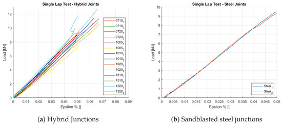 The experimental outcomes of the tests, extending up to the removal of the extensometer, are depicted in Figure 12. Panel (a) represents Hybrid Junctions with SC cells, while panel (b) illustrates junctions with a sandblasted metal substrate. Subsequent to extensometer removal, the tests proceeded until the rupture of the specimens. A brittle failure was observed in all specimens. The ultimate load attained by each tested specimen, along with the Young Modulus of the junction, is detailed in Table 8. Two distinct average stresses of the junctions were computed: one for tensile stress () and the second for shear stress ().