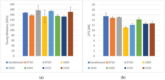 Comparison between sandblasted steel junctions and Hybrid Junctions: (a) Young Modulus. (b) Ultimate Tensile Stress.