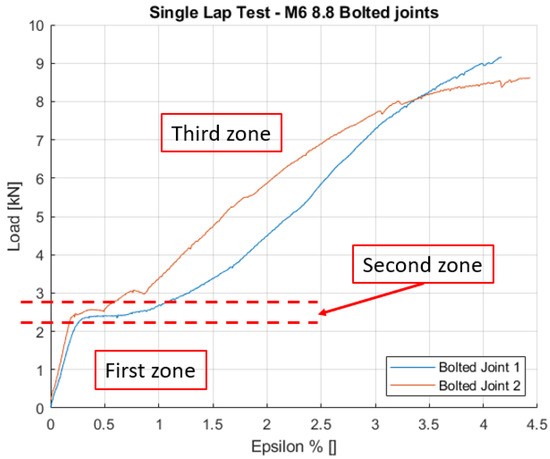 The Load-Strain curve reveals three distinct regions: the initial region, characterized by the highest stiffness, where the applied sliding load is transmitted by friction; the second region featuring a plateau, indicating that the applied load surpasses the static friction load, leading to sliding between the two components; and the commencement of the third region, where the clearance between the bolt and the components has been recovered, resulting in the bolt functioning under pure shear load. The failure of the bolted junction occurred in the composite, adjacent to the hole, with the measured results outlined in Table 9. It is noteworthy that the maximum load achieved by the bolted junction is approximately half of the maximum load achieved by the co-laminated specimens. This observation underscores the contrasting mechanical behavior between the bolted junction and the co-laminated counterparts under the given loading conditions.