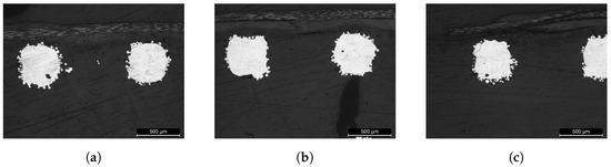 Microscope pictures of the impregnated Simple Cubic lattice structure—Specimen 1520. (a–c) show three different cross sections of the impregnated lattice. Notice the failure propagation in between the first layer of CFRP and the lattice.