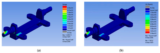Based on the statics analysis results, the fatigue life analysis of the axle bridge was carried out. The fatigue damage and life nephograms were obtained, as shown in Figure 5. From the damage nephogram, the damage degree of each part of the axle bridge can be seen. The red is the weak area, which is located at the left end of the axle journal and near the arc of the connection between the axle journal and the axle head. This indicates that these areas are prone to fatigue failure, which is basically consistent with the results of the static strength analysis.