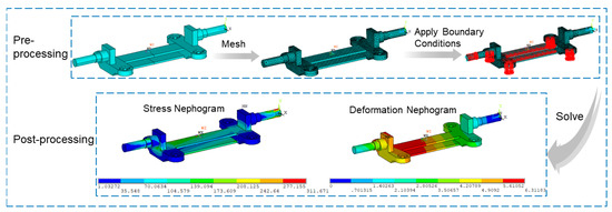 To reduce the finite element simulation time, it was necessary to conduct parametric modelling by means of APDL. Parametric modelling can achieve rapid adjustment of size parameters, automatic imposing of load and constraints, automatic generation of finite element analysis models, and rapid acquisition of response values such as stress, deformation, and fatigue life. The parametric modelling process of the axle bridge is shown in Figure 6.