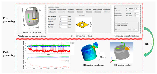 To obtain the cutting force at different turning parameters, AdvantEdge turning simulation was conducted in this paper. The AdvantEdge turning simulation process includes preprocessing the simulation parameter setting; solving; and result postprocessing; as shown in Figure 7. The simulation parameters for AdvantEdge turning are shown in Table 8. According to the cutting theory, the ratio of main cutting force, back force, and feed force in cutting is about 1:0.4:0.25 [27]. Among the cutting forces, the main cutting force is the largest, followed by the back force, and the feed force is the smallest. Therefore, the main cutting force is generally used as the response index during the cutting process.